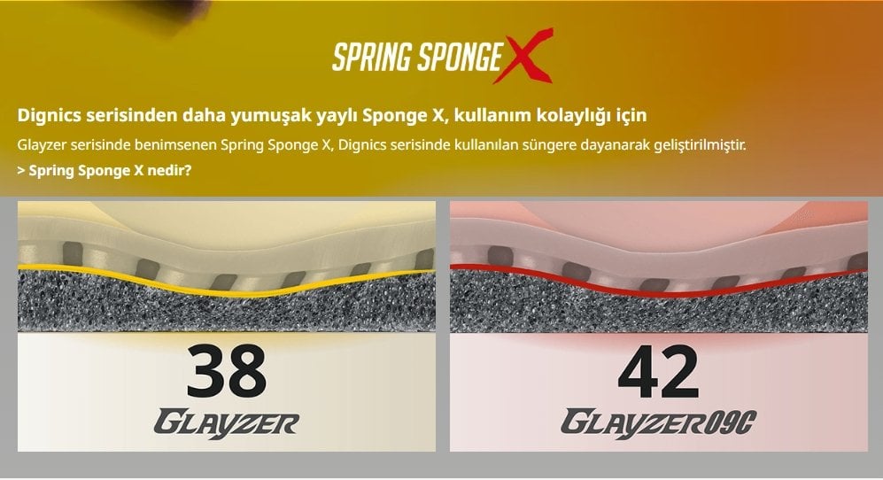 Glayzer'ın sünger sertliği 38 derece, Glayzer 09C'nin ise 42 derecedir. Glayzer'ı Dignics 05 ile ve Glayzer 09C'yi de Dignics 09C ile karşılaştırdığımızda, her ikisi de iki derece daha yumuşaktır.