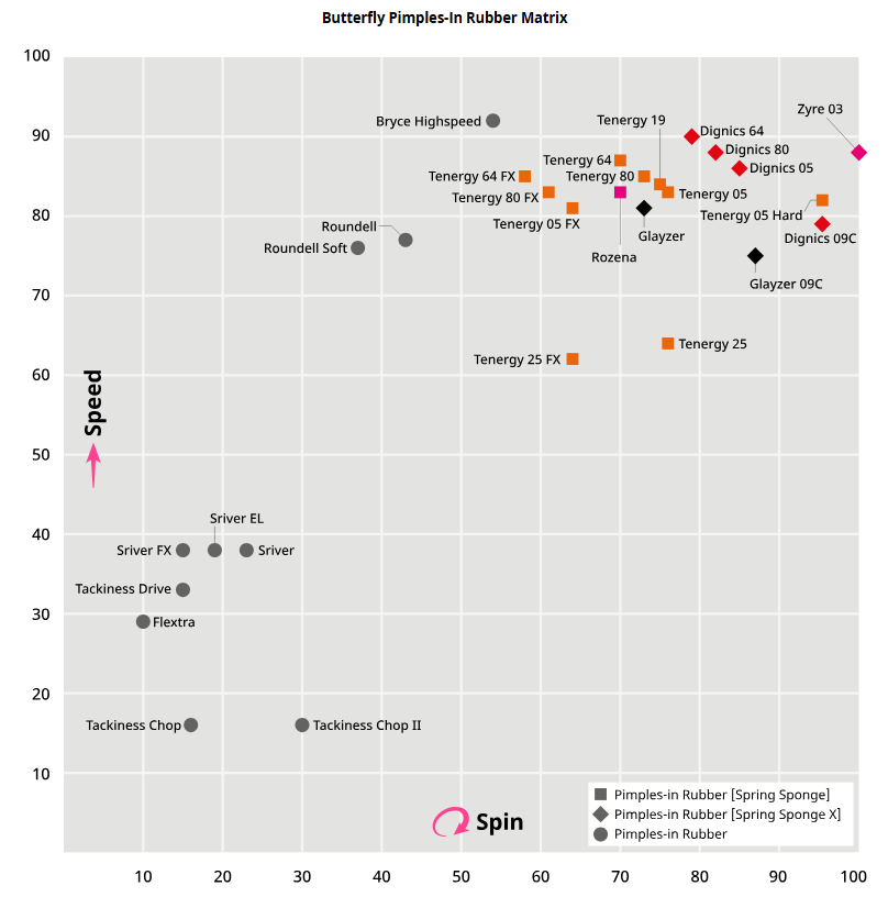 Spin / Spin (Pimples-out): Lastiğin, Butterfly'ın benzersiz testleriyle ölçülen/değerlendirilen, top üzerinde üretilen spin miktarı üzerindeki etkisini göreceli olarak açıklar. Değer ne kadar yüksekse, üretilen spin miktarı da o kadar fazladır. Öte yandan, değer ne kadar düşükse, spinsiz top üretmek o kadar kolaydır.