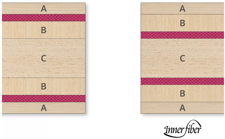 Bunun aksine, Innerfiber™ yapısına sahip tahtalarda, ahşap çekirdeğin yakınında yapay elyaf katmanları bulunur; bu, ilk olarak 2009 yılında Butterfly tahtalarda tanıtılan bir konfigürasyondur. Bu yapı, elyafın benzersiz özelliklerini korurken daha uzun bir bekleme süresi sağlar.