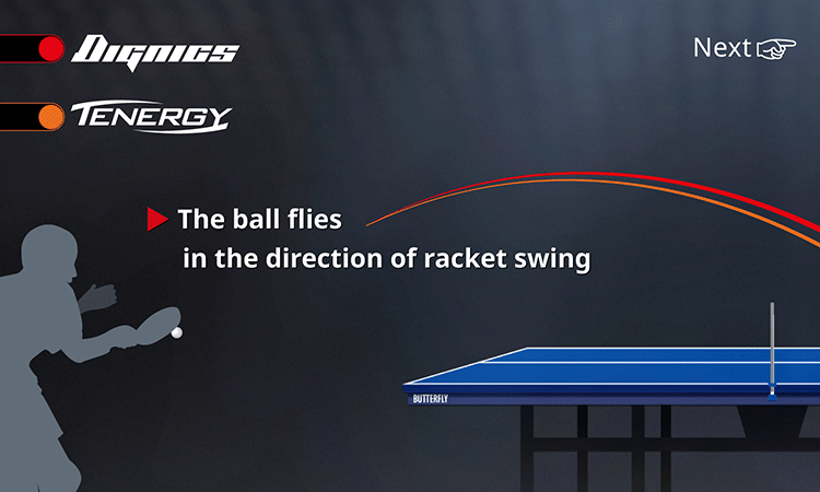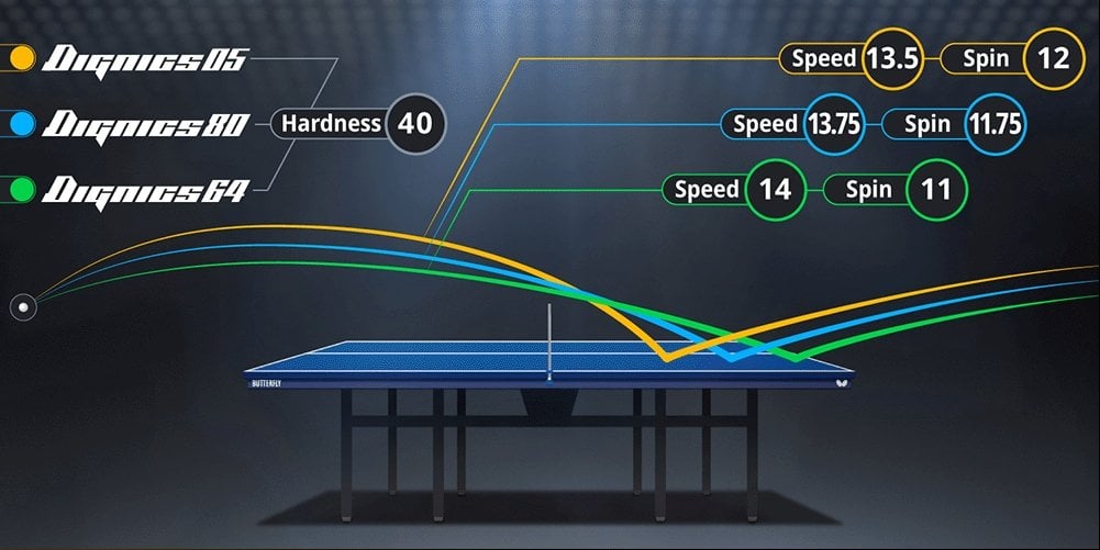 Dignics 05, masaya yakın kontra atak oyununun yanı sıra yoğun topspinli "muz vuruşu"na olanak tanırken, "80" daha yüksek seviyede çok yönlü bir oyunu desteklerken, "64" orta mesafeden topspin oyununa karşı en güçlü topspin'i destekler.