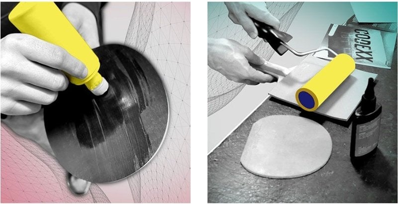 Öncelikle yapıştırıcı, ahşabın ve ilk lastiğin bir tarafına dikkatlice uygulanır ve ardından küçük bir süngerle eşit şekilde yayılır. Bundan sonra, yapıştırıcının önce kuruması gerekir. Çoğu yapıştırıcıda, renk daha sonra yavaşça süt beyazından şeffafa dönüşmelidir ve ancak o zaman lastik ahşaba yapıştırılabilir. Bunu yapmak için, lastiğin alt kenarı (yazılı taraf) önce ahşap sapın üst kenarına yerleştirilmelidir. Lastiğe herhangi bir baskı uygulamadan, alttan üste doğru ahşaba bastırın. Eşit bir basınç elde etmek için, bir baskı silindiri kullanmanızı öneririz. Basınç çok fazla olursa, lastiğin oyun özellikleri değişebilir. Ayrıca, kauçuğun bir süre sonra tekrar büzülmesi ve dolayısıyla ahşaba düzgün bir şekilde oturmaması çok olasıdır.
