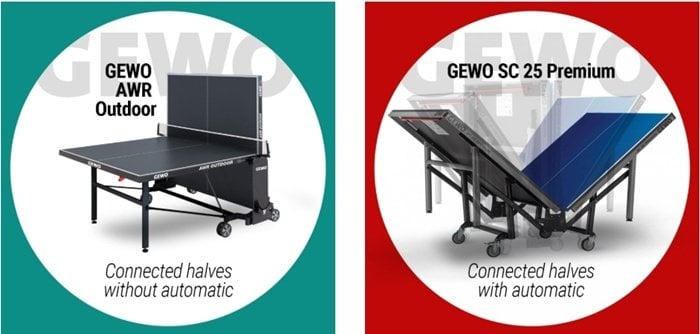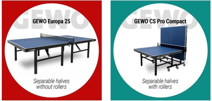 İkinci varyant olan, tekerlekli iki ayrılabilir masa yarısı, tekerlekleri nedeniyle tekerleksiz masalara göre biraz daha fazla depolama alanı gerektirir. Bununla birlikte, birbirlerine mükemmel bir şekilde itilebildikleri için oldukça kolay bir şekilde saklanabilirler. Ayrılabilir masa yarısının her iki varyasyonu da kurulumda büyük bir esneklik sunar. Antrenman sırasında biraz çeşitlilik sağlamak için herhangi bir kombinasyonda özellikle büyük veya geniş masalar kolayca oluşturabilirsiniz. Ayrılabilir yarıların bir diğer avantajı da, bir tarafın diğer kurulu tarafa dik olarak yaslandığı "geri dönüş" pozisyonuna yerleştirilebilmeleridir. Bu şekilde tek başınıza masa tenisi de oynayabilirsiniz ve dik taraf topu bir tür geri dönüş tahtası gibi ileri geri getirir.
