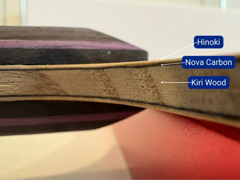 Tahtanın yapısı, Hinoki dış katmanları, Nova karbon fiber katmanları ve Kiri ahşap çekirdeği içeren 5 katmanlı (3 ahşap + 2 karbon) bir tasarıma sahiptir. Kenarı incelediğinizde, belirgin katmanları açıkça görebilirsiniz: daha kalın Hinoki dış katmanlar (~1,5 mm), ardından siyah karbon levhalar ve daha açık renkli Kiri çekirdek. Toplam kalınlık yaklaşık 6,2 mm'dir.Nova Carbon, doğrudan ve doğrusal bir oyun tarzını tercih eden hücum oyuncuları için en uygun rakettir. Özellikle kontrollü gücünün tam olarak kullanılabileceği yakın ve orta mesafeli mücadelelerde mükemmel performans gösterir.