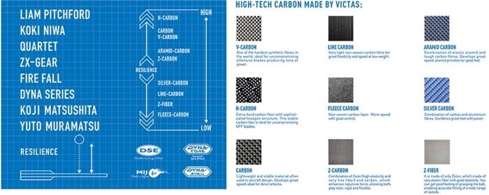 VICTAS, tahta serilerinde dokuz farklı yüksek teknoloji ürünü sentetik karbon türü kullanmaktadır – çok sayıda seçenek mevcuttur! Çok sert V-Karbon'dan süper elastik Z-elyafına kadar. Her karbon elyafının kendine özgü özellikleri vardır; bazıları dokunmuşken, diğerlerinde ek unsurlar ve dokuma karışımları bulunur!