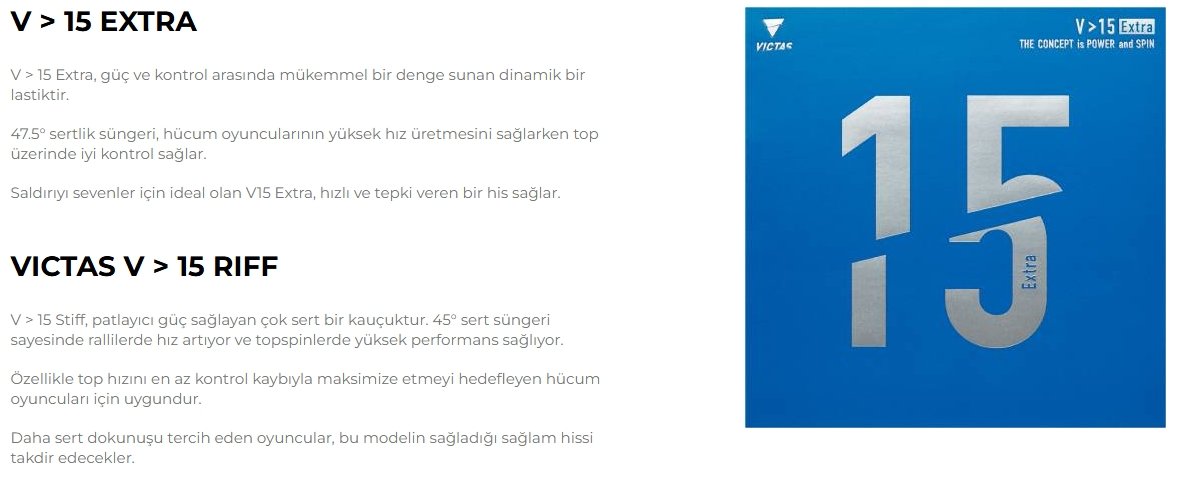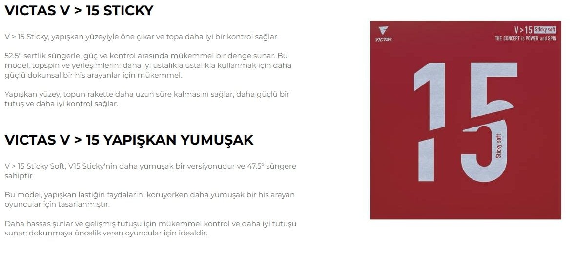 Sürekli gelişen ekipman ve oyun teknikleriyle birlikte, Victas V > 15 serisi modern masa tenisinin taleplerini karşılamak üzere geliştirilmiştir. İster rallileri hızlandırmak, ister spini iyileştirmek veya pasif aşamalarda kontrolü artırmak olsun, bu serideki her lastik belirli ihtiyaçları karşılar. Sünger ve üst yüzey arasındaki mükemmel sinerji sayesinde, bu lastikler oyunculara her vuruşta optimum hissi korurken oyunlarını bir üst seviyeye taşıma fırsatı sunar.