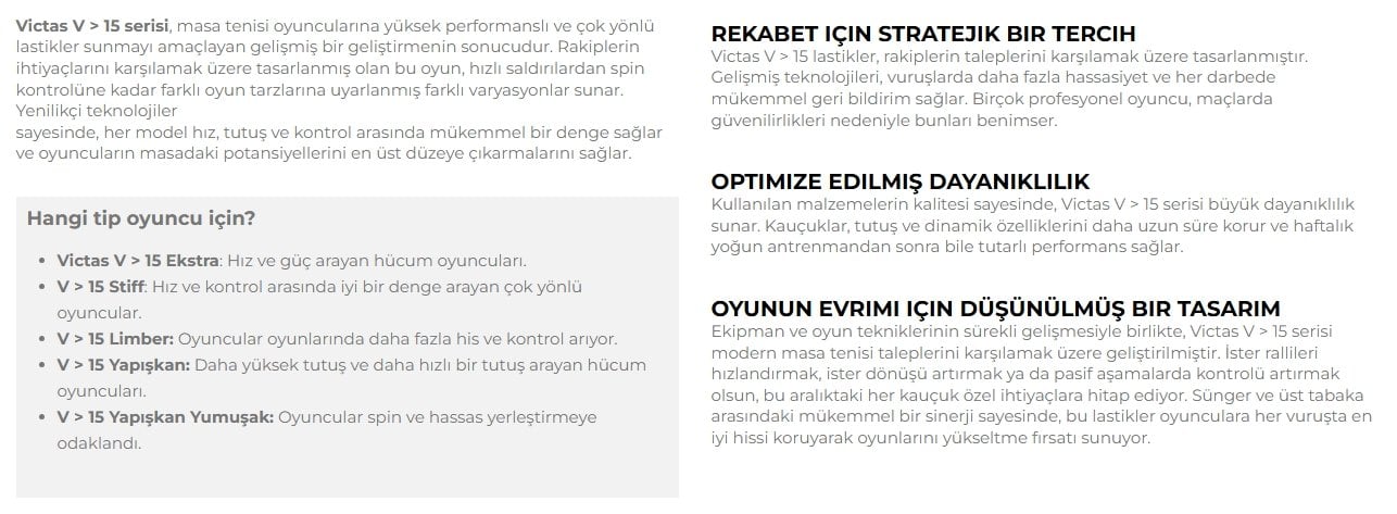 Victas V > 15 serisi, masa tenisi oyuncularına yüksek performanslı ve çok yönlü lastikler sunmayı amaçlayan gelişmiş bir çalışmanın sonucudur. Yarışmacıların ihtiyaçlarını karşılamak üzere tasarlanan bu seri, hızlı ataklardan spin kontrolüne kadar çeşitli oyun stillerine uygun farklı varyasyonlar sunmaktadır.