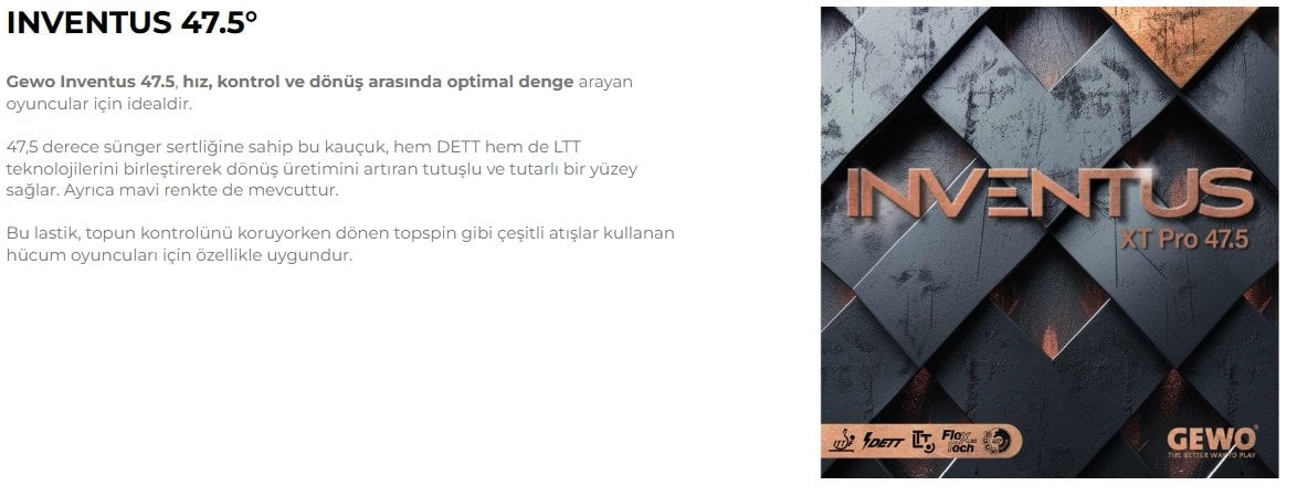 Gewo Inventus 47.5, hız, kontrol ve dönüş arasında mükemmel bir denge arayan oyuncular için tasarlanmıştır. 47,5 derece sertliğe sahip bir süngere sahip bu lastik, tutuşlu ve tutarlı bir yüzey sağlayan teknolojiler kullanarak spin yaratma yeteneğini artırır.