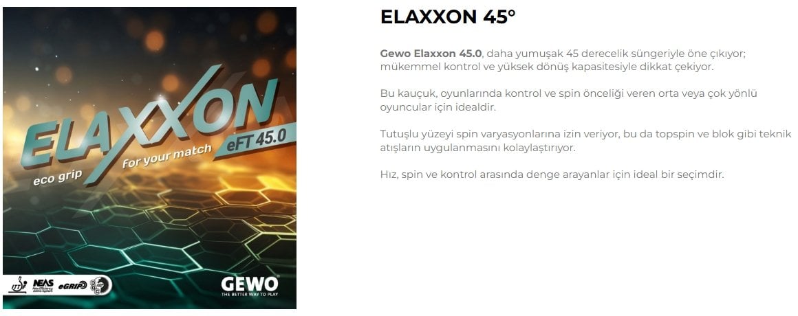 Gewo Elaxxon 45°, orta veya çok yönlü oyuncular için idealdir; 45° süngeri sayesinde mükemmel kontrol ve yüksek spin üretme kapasitesine sahiptir.