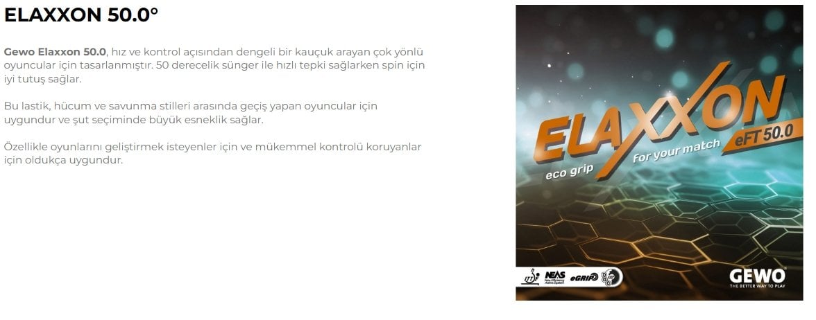 Gewo Elaxxon 50.0, hız ve spin arasında denge arayan hücum oyuncuları için tasarlanmıştır. 50.0° sertlik oranıyla hızlı tepki ve dönme için iyi bir tutuş sağlıyor.