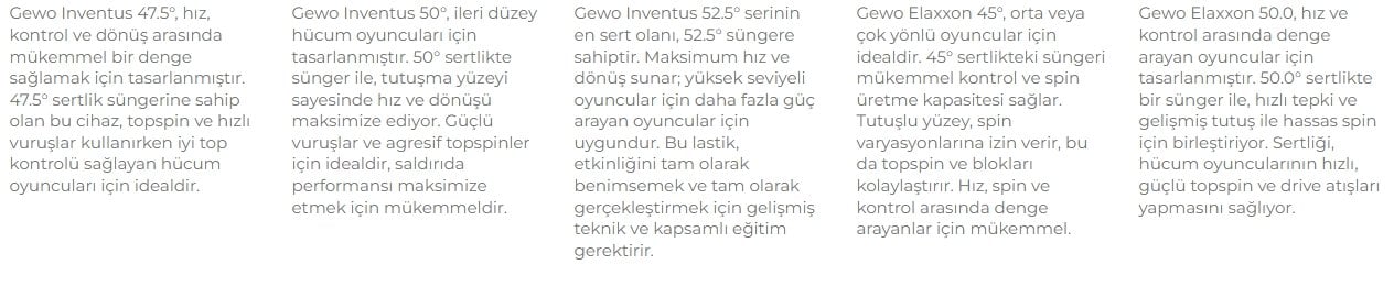 Gewo Inventus 50, 50 derece açıda biraz daha sert bir süngere sahiptir ve bu da onu ileri düzey hücum oyuncuları için ideal kılar. Hız ve spinin güçlü bir kombinasyonunu sunar, güçlü vuruşlar ve agresif topspinler yapmayı kolaylaştırır.