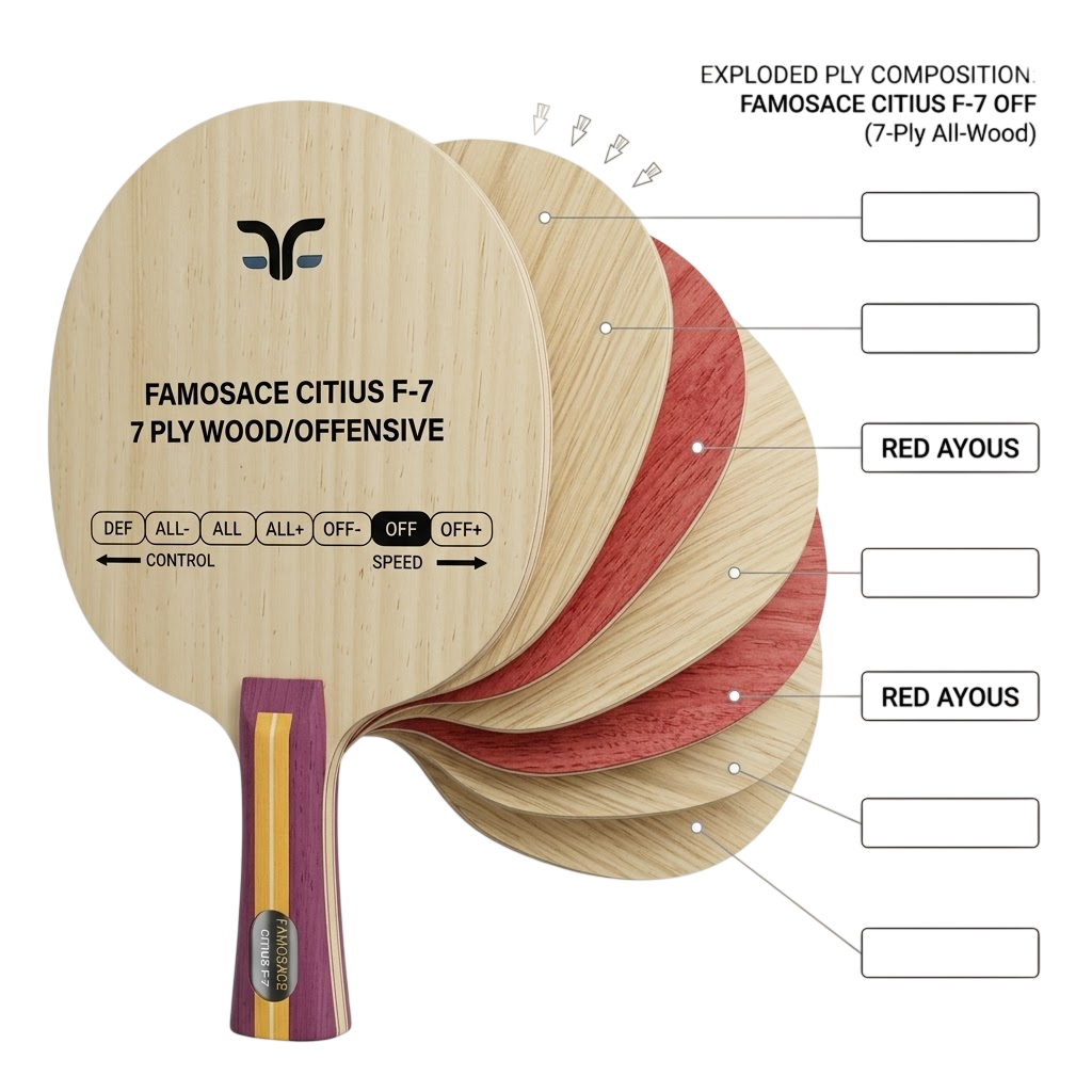 Masa tenisi dünyasının efsaneleşmiş 7 kat saf ağaç yapısını, günümüzün 40+ plastik top teknolojisine FAMOSACE CITIUS F-7 OFF ile taşıdık. Karbonun yapay sertliğine ihtiyaç duymadan saf doğallıkla yüksek hız üretmek isteyen profesyoneller için geliştirilen FAMOSACE CITIUS F-7 OFF, üstün işçiliğiyle yeni favoriniz olacak. Klasik Clipper CR ruhunu Türk tasarımıyla birleştiren FAMOSACE CITIUS F-7 OFF, kusursuz bir performans vaat eder. FAMOSACE CITIUS F-7 OFF modeli, sahadaki duruşu ve dinamik yapısıyla rakiplerinizi baskı altına almanızı sağlar.