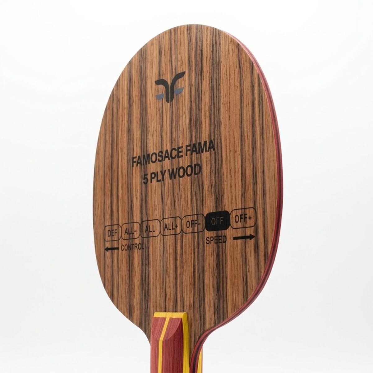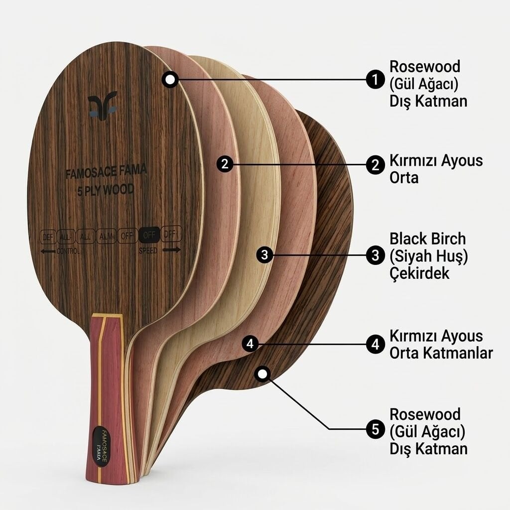 FAMOSACE FAMA OFF modelinin dış katmanında kullanılan Rosewood (Gül Ağacı), dünyanın en dayanıklı ağaçlarından biri olarak kristal netliğinde bir geri bildirim sunar. FAMOSACE FAMA OFF bünyesindeki Black Birch (Siyah Huş) çekirdek yapısı ise darbe emilimini optimize ederken hücum anında patlayıcı bir güç üretir. Kırmızı Ayous orta katmanları sayesinde FAMOSACE FAMA OFF, topspin oyunlarında topun tahtada kalma süresini artırarak spin kalitenizi zirveye taşır. FAMOSACE FAMA OFF, sert ve net hissiyatıyla her vuruşta karakterini belli eden bir tahtadır.