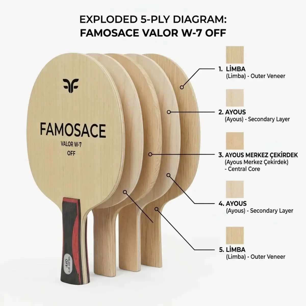 Masa tenisinde karbonun yapay sertliği yerine ağacın doğal esnekliğini tercih eden sporcular için FAMOSACE VALOR W-7 OFF sahadaki yeni cesaret kaynağınız oluyor. Tamamı özel seçilmiş 5 kat saf ağaçtan üretilen FAMOSACE VALOR W-7 OFF, hücum oyununda kontrolü elden bırakmak istemeyen sporcuların vazgeçilmezidir. FAMOSACE VALOR W-7 OFF modeli, doğal katmanların gücünü klasik offensive performansıyla birleştirerek oyuncuya eşsiz bir güven verir. FAMOSACE VALOR W-7 OFF ile masada her an topu parmak uçlarınızda hissedersiniz. FAMOSACE VALOR W-7 OFF, profesyonel bir gelişim tahtası arayanların ilk tercihidir. FAMOSACE VALOR W-7 OFF sayesinde her antrenman bir gelişim fırsatına dönüşür. FAMOSACE VALOR W-7 OFF kalitesini her vuruşta hissedin.