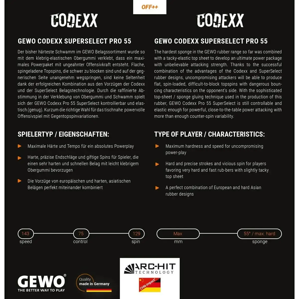Masada taviz vermeyen profesyoneller için üretilen GEWO Codexx Super Select Pro 55, hızı ve spini daha önce hiç olmadığı kadar agresif bir dengede sunuyor. Serinin en güçlü modeli olan GEWO Codexx Super Select Pro 55, 55 derecelik ultra sert süngeriyle masaya yakın oyunda rakipleri çaresiz bırakan bir performans sağlar. Yüksek enerjili ve doğrudan bir oyun karakterine sahip olan GEWO Codexx Super Select Pro 55, modern masa tenisinin tüm gereksinimlerini karşılar.