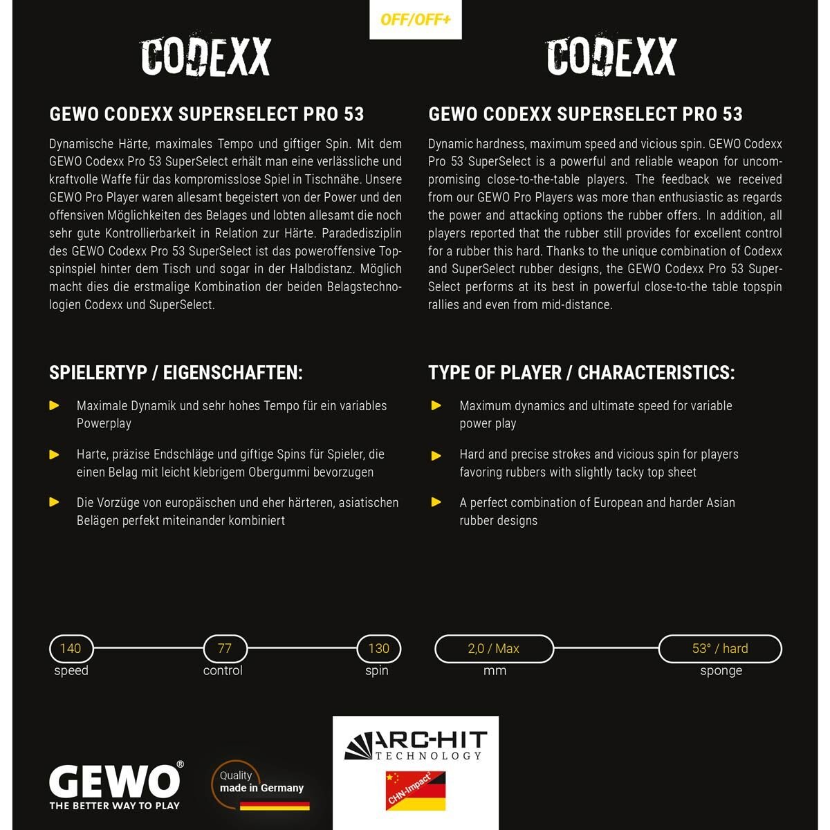 Dinamik sertlik, maksimum hız ve kısır dönüş. GEWO Codexx Pro 53 SuperSelect, ödün vermeyen masaya yakın oyuncular için güçlü ve güvenilir bir seçimdir. GEWO Pro Oyuncularımızdan aldığımız geri bildirimler, lastiğin sunduğu güç ve atak seçenekleri konusunda hevesli olmaktan da öteydi. Ek olarak, tüm oyuncular, lastiğin bu kadar sert bir lastik için hala mükemmel kontrol sağladığını bildirdi. Codexx ve SuperSelect lastik tasarımlarının benzersiz kombinasyonu sayesinde, GEWO Codexx Pro 53 SuperSelect en iyi performansını masaya yakın güçlü spin rallilerinde ve hatta orta mesafeden gösterir.