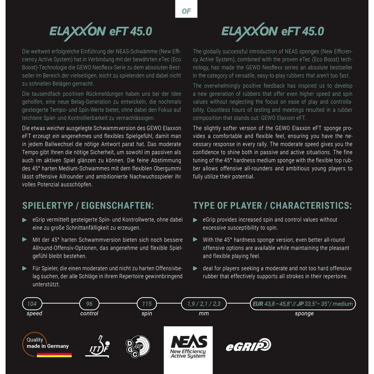 NEAS süngerlerinin (Yeni Verimlilik Aktif Sistemi) dünya çapında başarılı bir şekilde piyasaya sürülmesi, kanıtlanmış eTec (Eco Boost) teknolojisiyle birleştiğinde, GEWO Neoflexx serisini çok yönlü, oynaması kolay lastikler kategorisinde mutlak en çok satan ürün haline getirdi. Çok hızlı. Son derece olumlu geri bildirimler, oyun kolaylığı ve kontrol edilebilirliğe odaklanmayı ihmal etmeden daha yüksek hız ve dönüş değerleri sunan yeni nesil lastikler geliştirmemiz için bize ilham verdi. Özellikle genç oyuncular veya çok fazla kontrolden ödün vermeden biraz daha fazla hız ve çeşitlilik isteyenler, yeni GEWO Elaxxon eFT çeşitlerinin keyfine varacaklar.