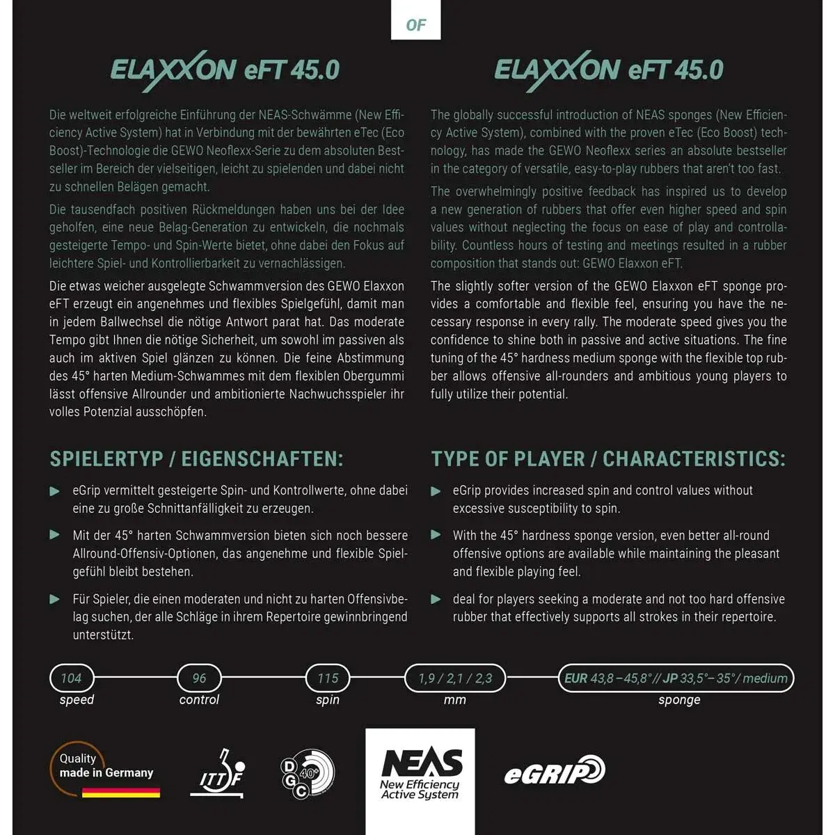 GEWO Elaxxon eFT 45 modelinde kullanılan eFT (eco-Boost for Table Tennis) teknolojisi, üst yüzeydeki tutuşu artırarak topun kaymasını önler. Bu teknolojik avantaj sayesinde GEWO Elaxxon eFT 45, servislerde ve spinli vuruşlarda oyuncuya daha fazla güven ve net bir geri bildirim sunar. Optimize edilmiş 45 derece süngeriyle GEWO Elaxxon eFT 45, topspin vuruşlarında harika bir trambolin etkisi yaratırken bloklarda mükemmel bir sönümleme yeteneği sergiler.