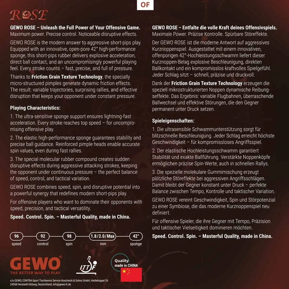 GEWO REOSE, ofansif oyununuzun tüm gücünü serbest bırakmak için tasarlanmış profesyonel bir lastiktir. Masa tenisinde kısa pütür kullanırken maksimum güç arayanlar için GEWO REOSE, en yenilizçi çözümü sunar. Açık gözenekli 42 derece süngeri sayesinde GEWO REOSE, patlayıcı bir ivmelenme ve doğrudan top teması sağlayarak oyununuza tavizsiz bir güç katar.