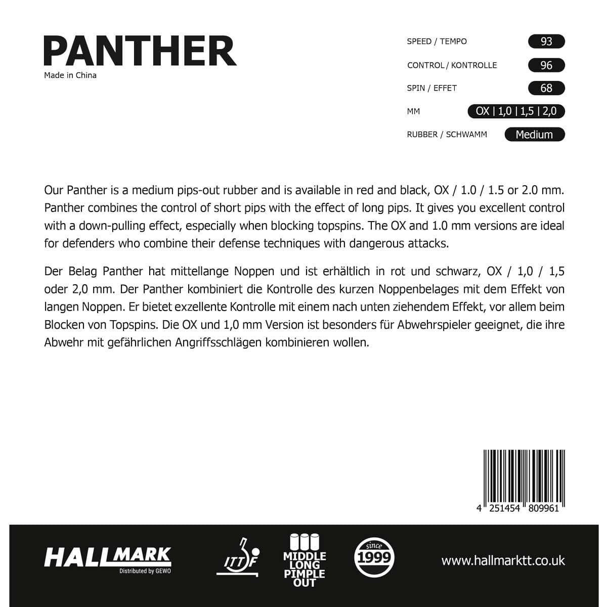 Panther, kısa pütürlerin kontrolünü uzun pütürlerin etkisiyle birleştirir. Özellikle top spinleri bloklarken, aşağı çekme etkisi ile size mükemmel kontrol sağlar. OX ve 1,0 mm versiyonları, savunma tekniklerini tehlikeli saldırılarla birleştiren savunmacılar için idealdir.