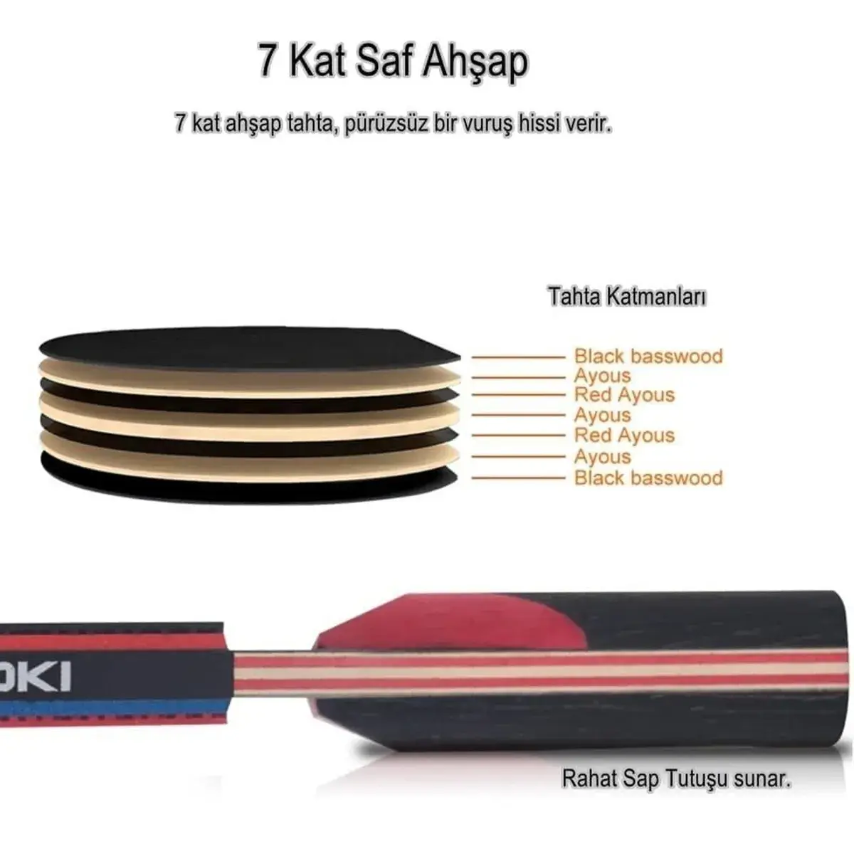 7 Katmanlı Saf Ağaç Tahta: Raketin gövdesi, stabilite ve güç sağlayan 7 katmanlı özel seçilmiş ağaçtan üretilmiştir. Bu yapı, vuruş anında titreşimi minimize ederek net bir his sunar.